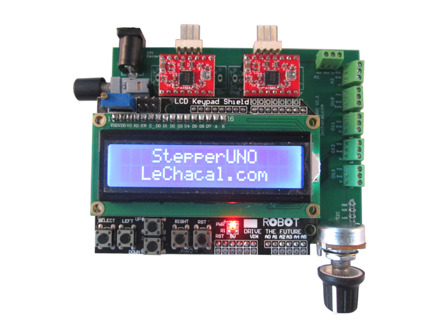 Based on the pattern of the Arduino UNO it is designed to host a LCD keypad shield. This combination makes the stepperUNO an excellent board for application control.
