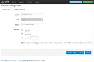 On this page enter the Essid that you would like to use (Using OpenWRT in this example). Make sure that LAN is ticked in the Network section. Then save it with Save & Apply.
